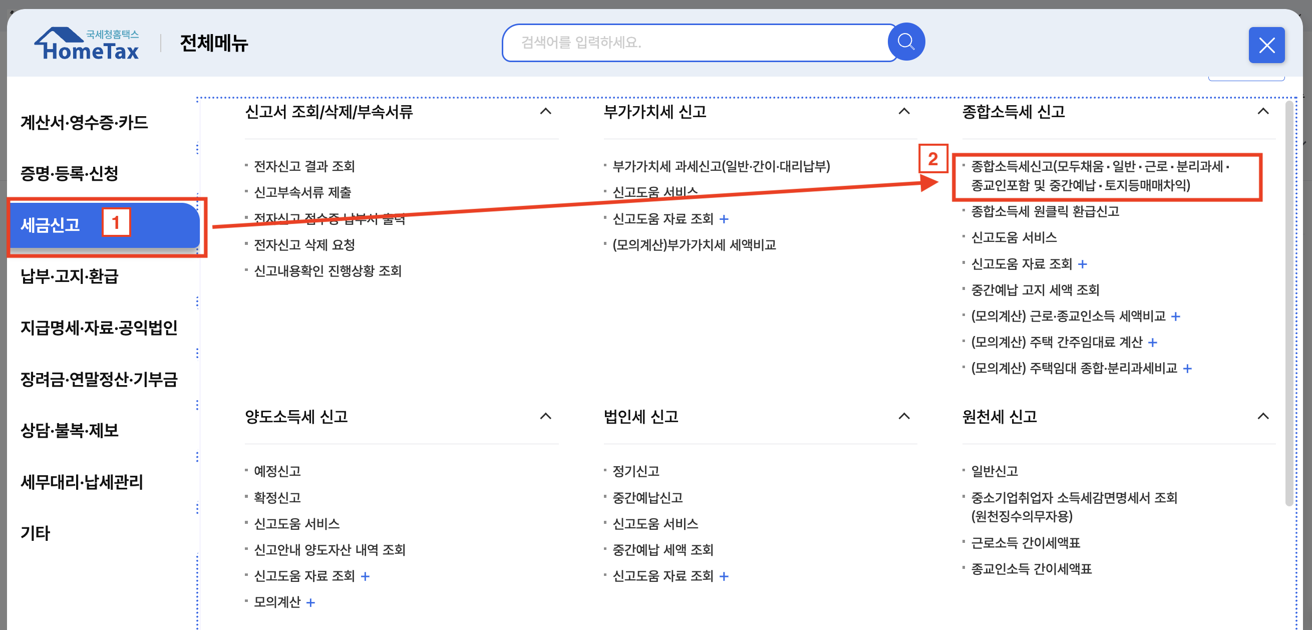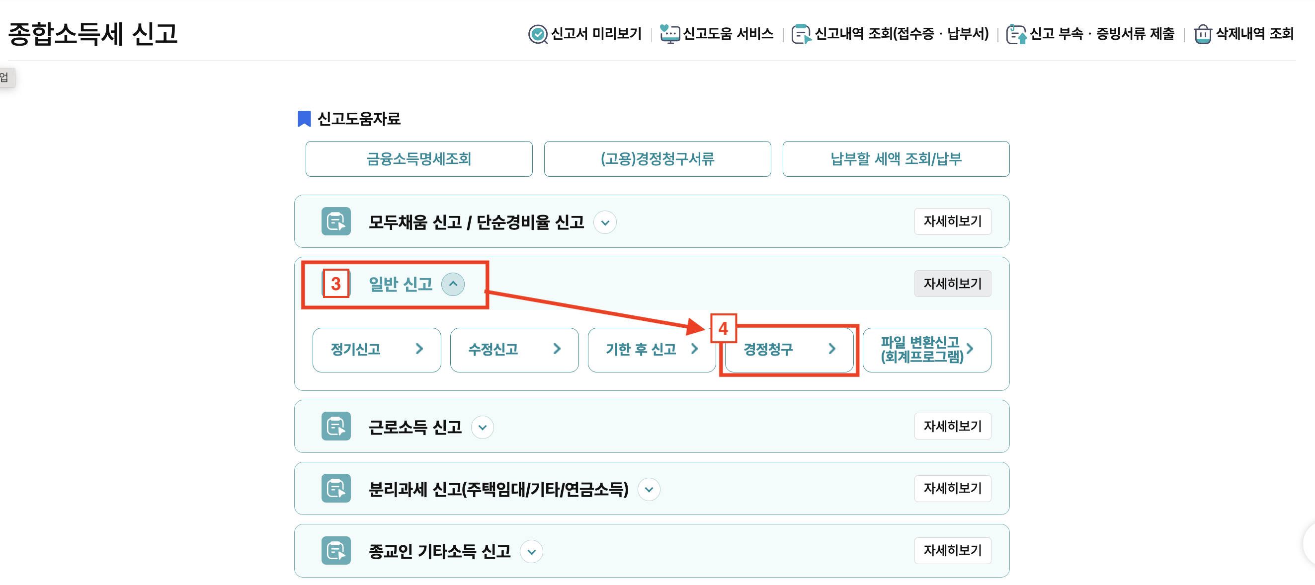 - 홈택스 접속 → [전체메뉴] → [세금신고] → [종합소득세신고] → [일반신고] → [경정청구]